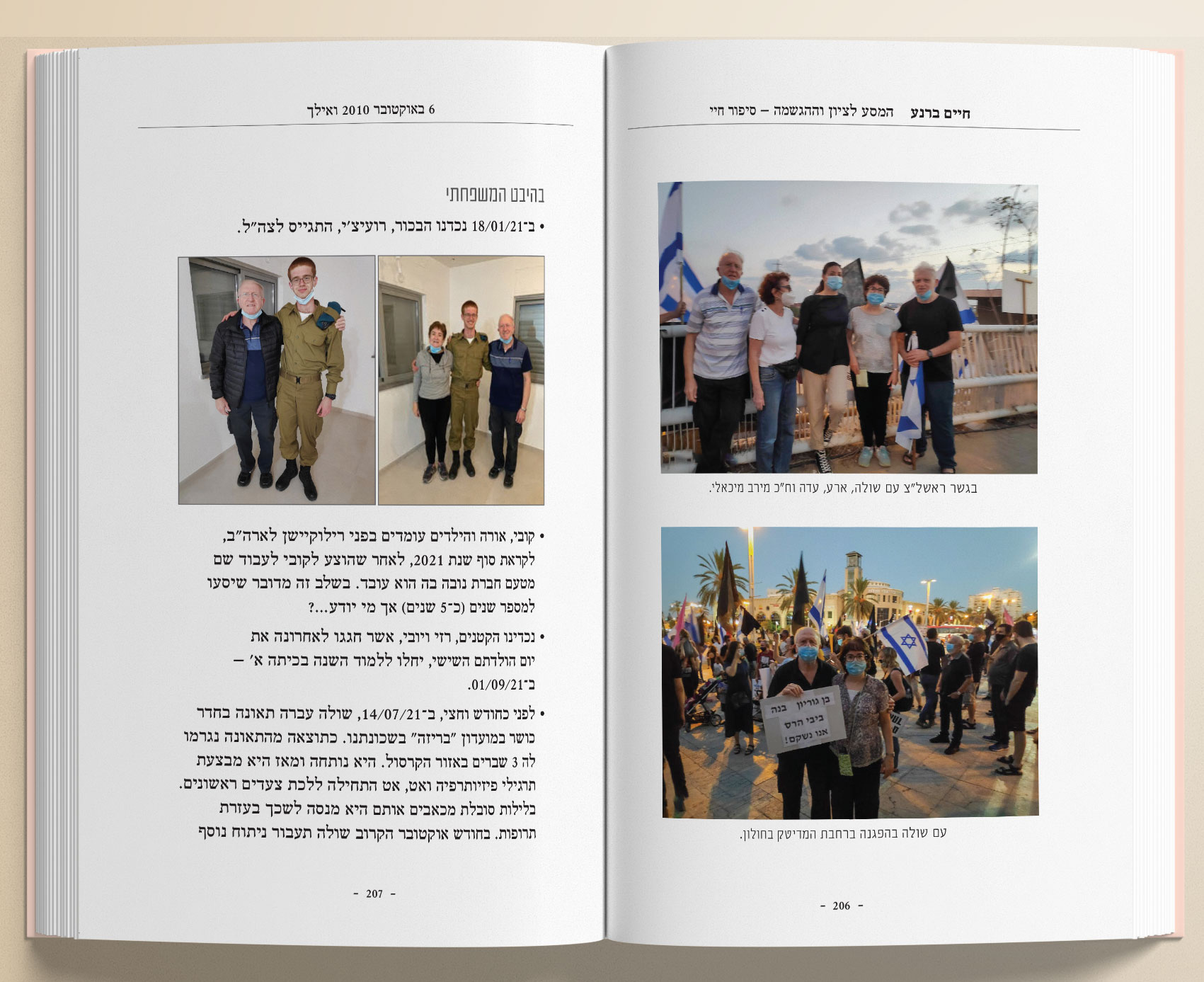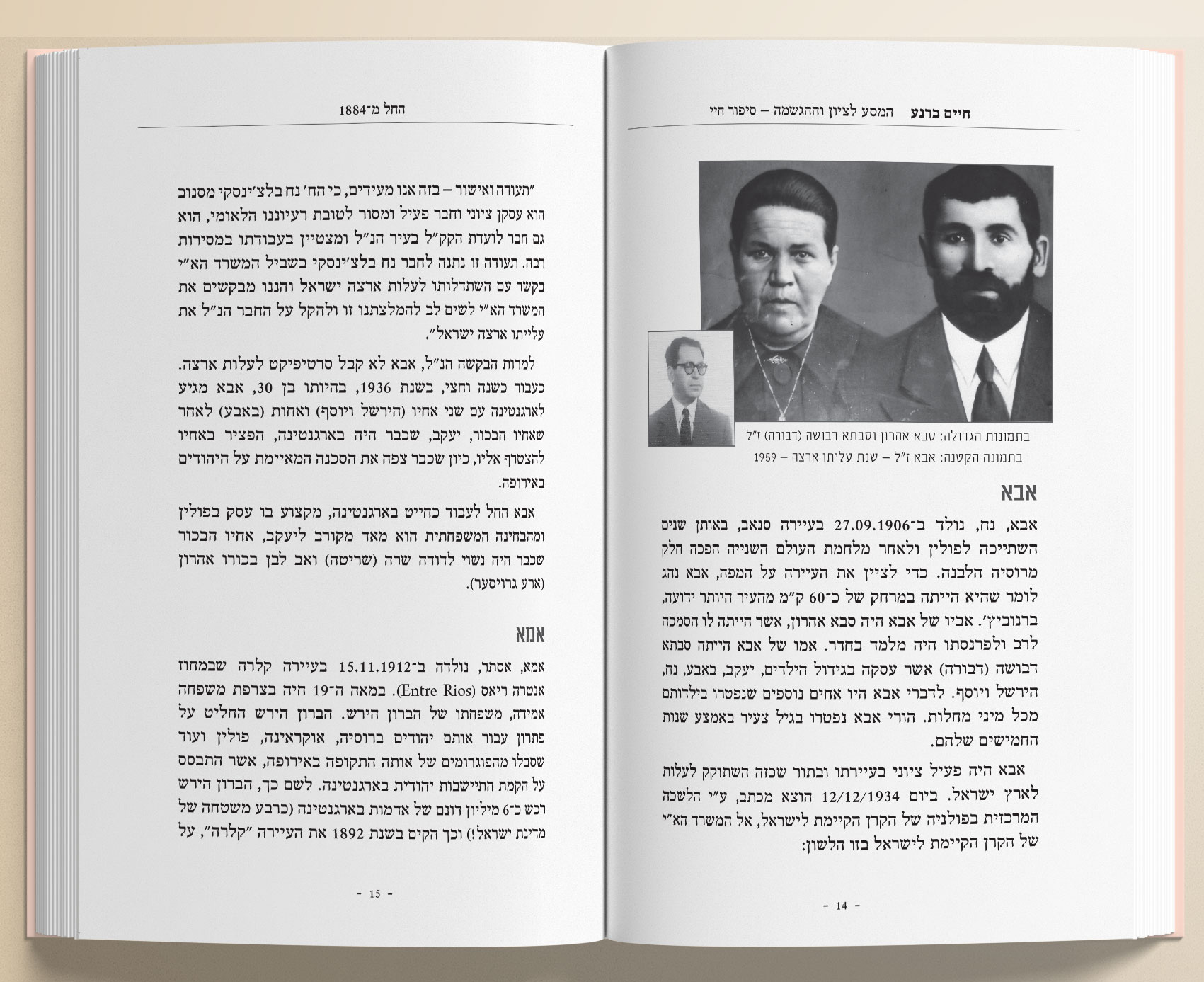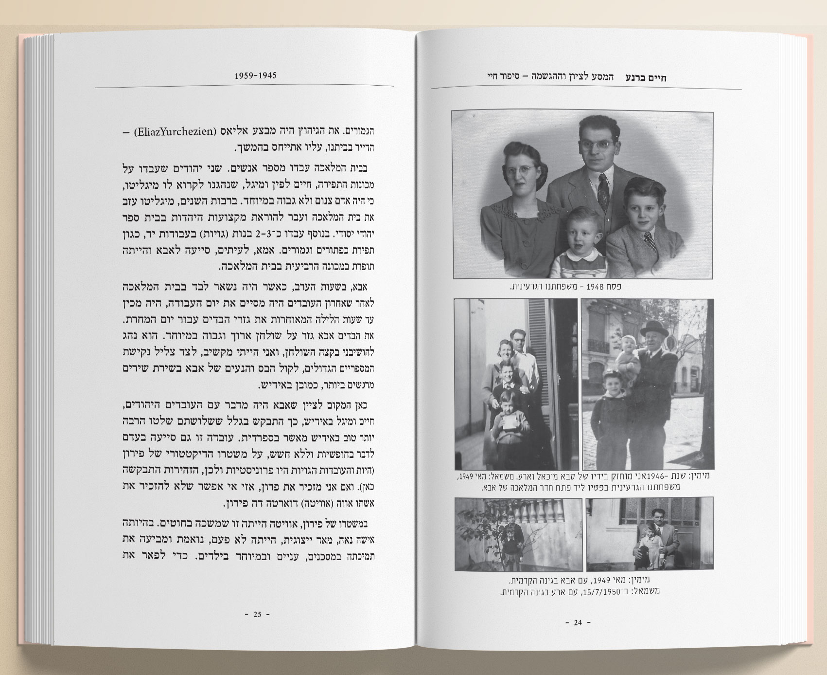 ספרו של חיים ברנע הוא דוגמה לעיצוב ועימוד ספר קורותיו של אדם, ספר זכרונות או ספר משפחתי. חיים מגולל כאן את סיפור משפחתו בליווי תמונות. גם פה העבודה משותפת. בחירת התמונות, הטיפול בהן ושיבוצן כך שגם ימוקמו נכון תוכנית, אבל גם יראו טוב וישתלבו נכון במראה הכללי של הספר