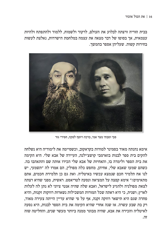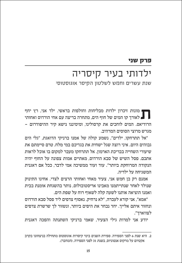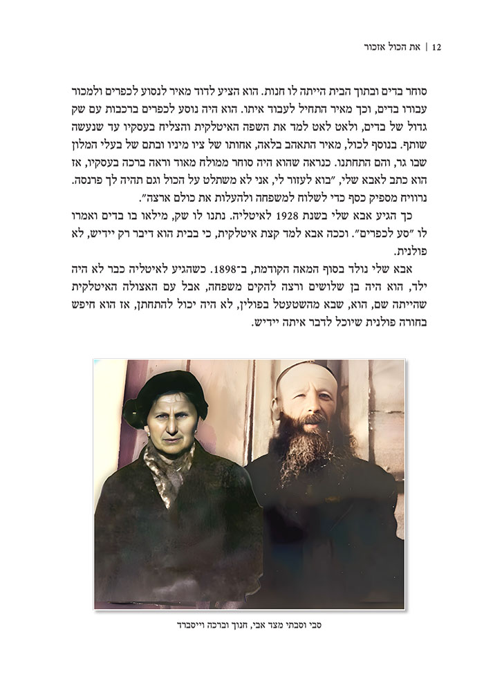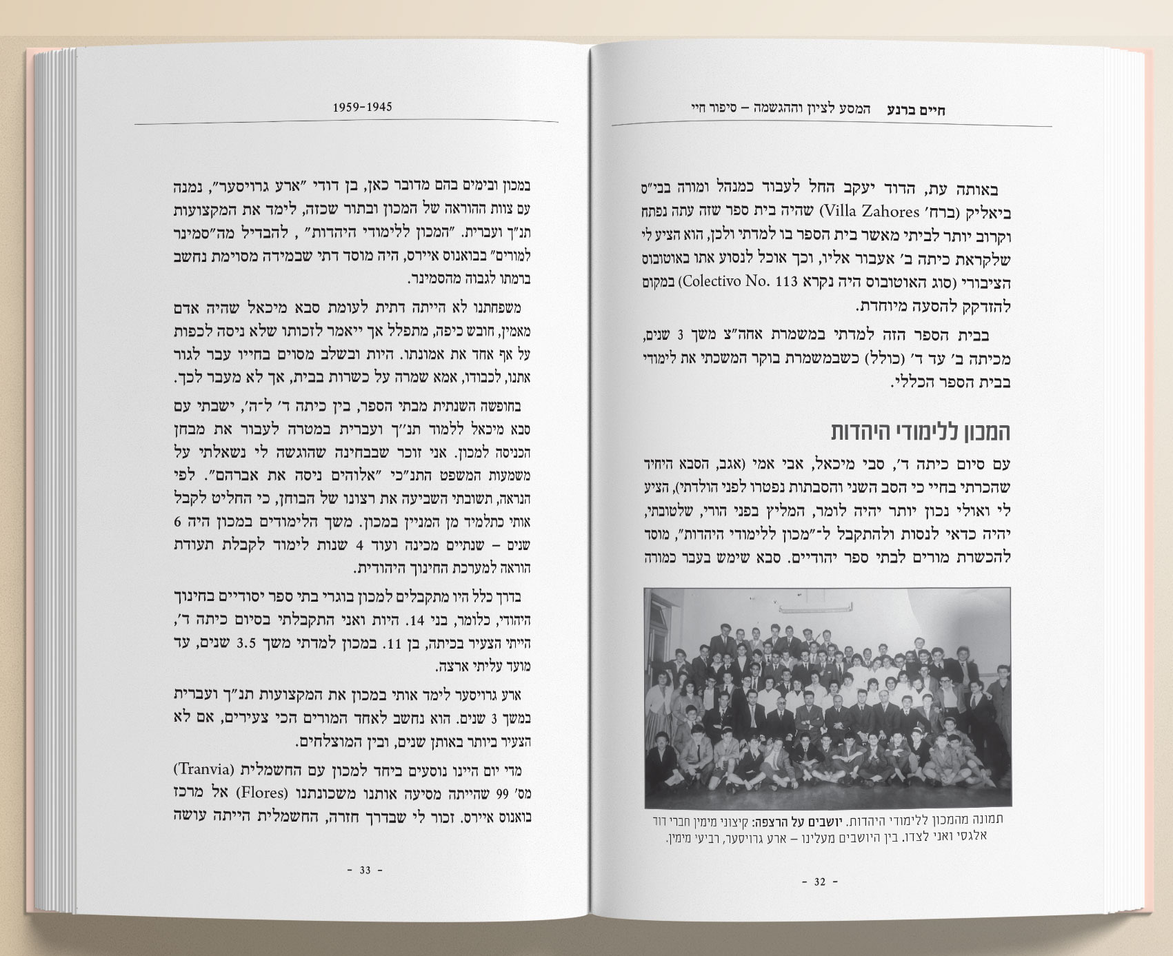 ספרו של חיים ברנע הוא דוגמה לעיצוב ועימוד ספר קורותיו של אדם, ספר זכרונות או ספר משפחתי. חיים מגולל כאן את סיפור משפחתו בליווי תמונות. גם פה העבודה משותפת. בחירת התמונות, הטיפול בהן ושיבוצן כך שגם ימוקמו נכון תוכנית, אבל גם יראו טוב וישתלבו נכון במראה הכללי של הספר